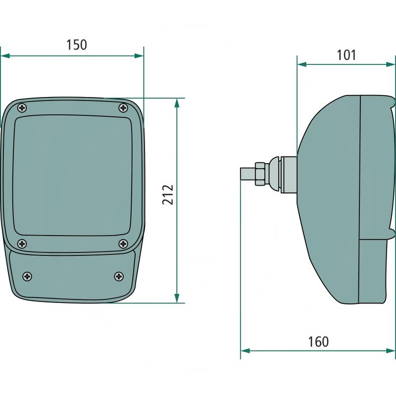 12V4WK / T4W - Version: For fixed mounting, with H7 dipped light, H3 full beam, position light and on the bottom flange mounted direction indicator light with one yellow lens to front and back. Reflector made of plastic bonded to glass lens. Black plastic casing and glass holder frame with protuberant edge to protect the diffusing lens. Universal holder with fixing screw M12. AMP plug connection. Light aperture: 120 x 120 mm