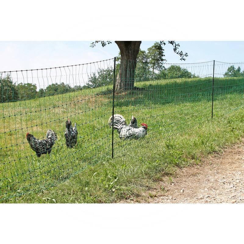 Euro-Netz products are flexible as uneven surfaces can be compensated for with extra posts and pegs. Ground strand reinforced, 32 plastic monofilaments Ø 0,4 mm, not live. Remaining strands each have 15 plastic monofilaments Ø 0,4 mm, 3 stainless steel wires Ø 0,2 mm. The vertical strands each have 15 plastic monofilaments Ø 0,4 mm. UV-stabilised, each mesh intersection point inextricably welded with plastic seal. - Length (m): 25